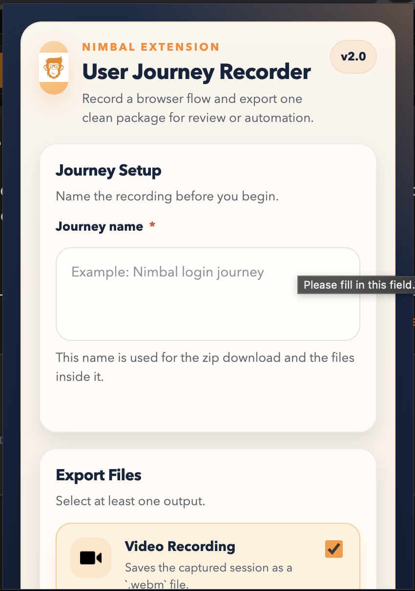 Nimbal User Journey is a Chrome browser extension that sits in your toolbar. When you click Record it watches everything you do on a webpage and converts it into Cucumber Gherkin test steps automatically.